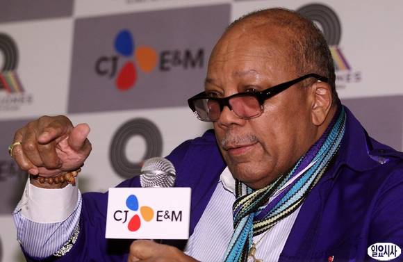 '팝의 전설' 퀸시 존스가 25일 오후 서울 삼성동 코엑스인터컨티넨탈 호텔에서 CJ E&M & 퀸시 존스 '글로벌 뮤직 파트너십' MOU 체결식에서 취재진의 질문에 답하고 있다.