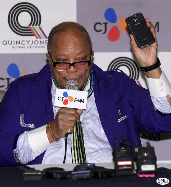 '팝의 전설' 퀸시 존스가 25일 오후 서울 삼성동 코엑스인터컨티넨탈 호텔에서 CJ E&M & 퀸시 존스 '글로벌 뮤직 파트너십' MOU 체결식에서 취재진의 질문에 답하고 있다.