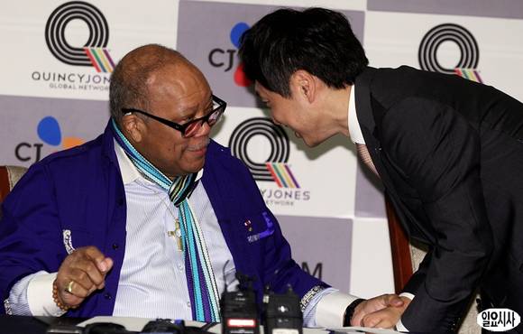 '팝의 전설' 퀸시 존스가 25일 오후 서울 삼성동 코엑스인터컨티넨탈 호텔에서 CJ E&M & 퀸시 존스 '글로벌 뮤직 파트너십' MOU 체결식에서 CJ E&M 음악사업부분 안석준 대표와 이야기를 나누고 있다.
