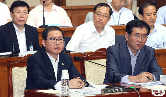 이성한 경찰청장(사진 왼쪽)이 25일 오전 국회에서 열린 국정원 댓글 의혹 국정조사에 증인으로 참석해 의원들의 질의에 답변하고 있다.