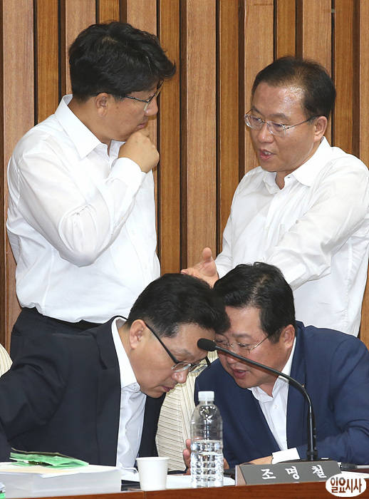 25일 오후 서울 여의도 국회에서 열린 국가정보원 댓글 의혹 사건 등의 진상규명을 위한 국정조사특별위원회 전체회의가 열리고 있는 가운데, 새누리당 조명철 의원(사진 왼쪽)과 이장우 의원이 귀엣말을 나누고 있다.