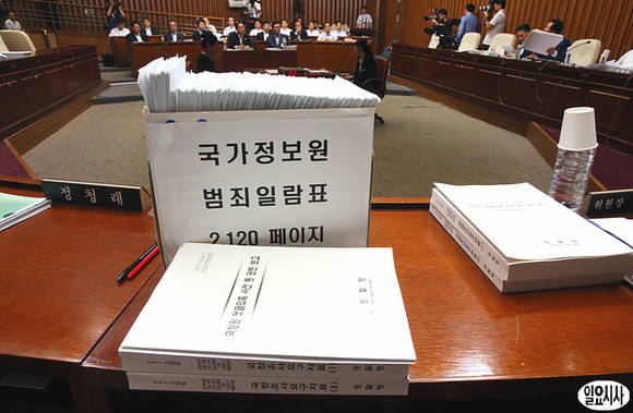 25일 오후 서울 여의도 국회에서 열린 국가정보원 댓글 의혹 사건 등의 진상규명을 위한 국정조사특별위원회 전체회의가 열리고 있는 가운데, 민주당 정청래 의원의 자리에 관련자료가 놓여져 있다.
