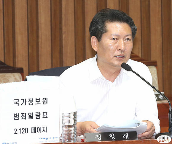 25일 오후 서울 여의도 국회에서 열린 국가정보원 댓글 의혹 사건 등의 진상규명을 위한 국정조사특별위원회 전체회의가 열리고 있는 가운데, 민주당의 떠오르는 '저격수'로 불리는 정청래 의원이 이성한 경찰청장에게 질의하고 있다.