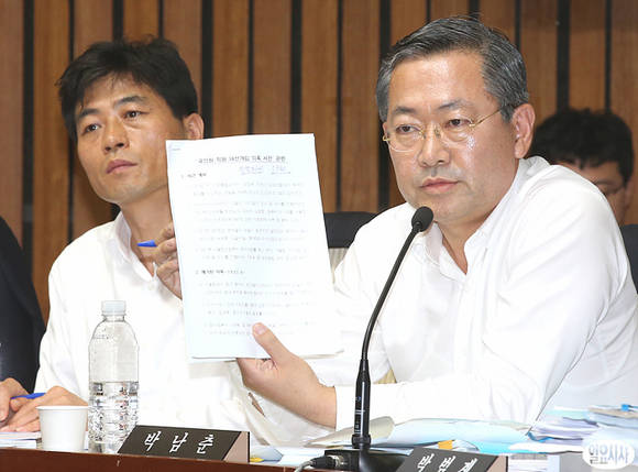 25일 오후 서울 여의도 국회에서 열린 국가정보원 댓글 의혹 사건 등의 진상규명을 위한 국정조사특별위원회 전체회의가 열리고 있는 가운데, 민주당 박남춘 의원이 관련자료를 들어보이고 있다.