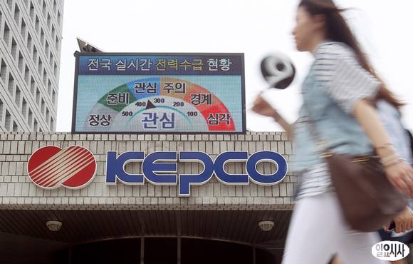 연일 계속되는 폭염으로 전력수급경보 '관심' 단계가 발령된 9일 오후 서울 삼성동 한국전력공사 앞 전광판이 현재 전력수습 상황을 표시하고 있다.