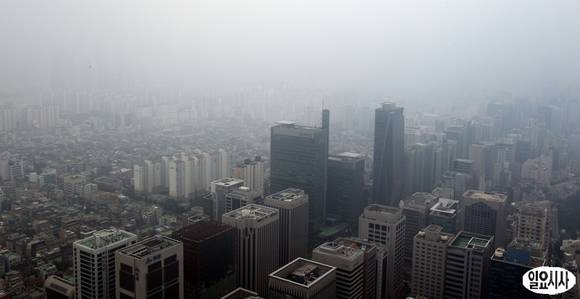 연일 계속되는 무더위 속에 9일 오후 서울 삼성동 무역센터에서 바라본 하늘이 짙은 안개에 휩싸여 있다. 서울 등 중부지방은 북쪽을 지나는 약한 기압골 영향을 받아 한두차례 비가 내리며 대체로 흐리다.