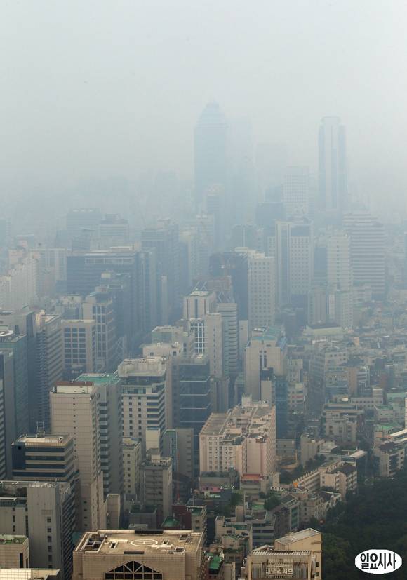 연일 계속되는 무더위 속에 9일 오후 서울 삼성동 무역센터에서 바라본 하늘이 짙은 안개에 휩싸여 있다. 서울 등 중부지방은 북쪽을 지나는 약한 기압골 영향을 받아 한두차례 비가 내리며 대체로 흐리다.
