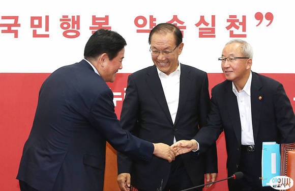12일 오전, 새누리당 황우여 대표, 현오석 경제부총리 등이 국회에서 열린 당정 세재개편안에 대한 논의를 위해 모인 자리에서 반가운 듯 악수를 나누며 인사하고 있다.
