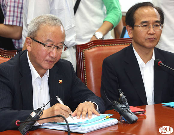 12일 오전, 새누리당 황우여 대표, 현오석 경제부총리(사진 왼쪽) 등이 참석한 가운데 국회에서 열린 당정 세재개편안에 대한 논의 도중 현 부총리가 메모를 하고 있다.