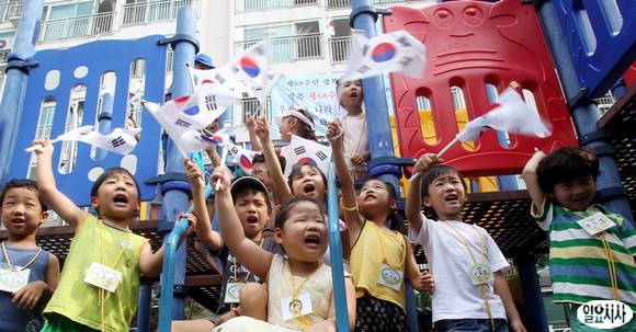 제68주년 광복절을 얼마 앞둔 12일 오전 서울 성동구 용답동에 위치한 한 아파트에서 관내 어린이집 아이들이 태극기를 휘날리고 있다.