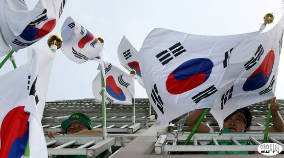 제68주년 광복절을 얼마 앞둔 12일 오전 서울 성동구 용답동에 위치한 한 아파트에서 새마을운동 성동구지회 회원들이 태극기를 휘날리고 있다.