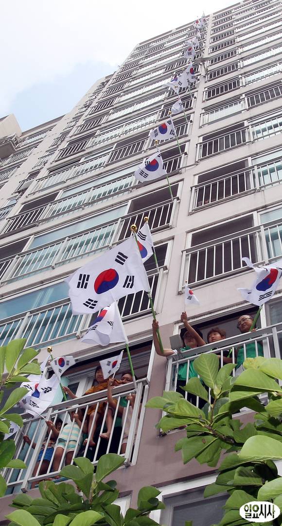 제68주년 광복절을 얼마 앞둔 12일 오전 서울 성동구 용답동에 위치한 한 아파트에서 새마을운동 성동구지회 회원들이 태극기를 휘날리고 있다.