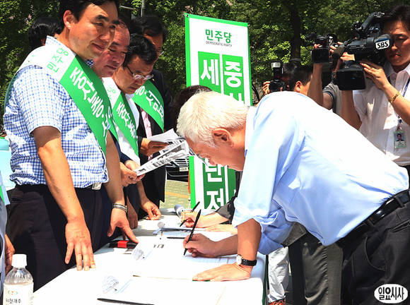 김한길 민주당 대표가 12일 오후 서울 여의도 도심거리에서 가진 '중산층서민 세금폭탄저지 특별위원회 발족식 후 직접 서명하고 있다.