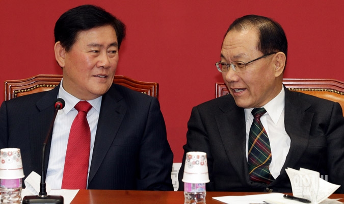 새누리당 황우여 대표(오른쪽)와 최경환 원내대표가 19일 서울 여의도 국회에서 열린 최고중진연석회의에서 이야기를 나누고 있다.