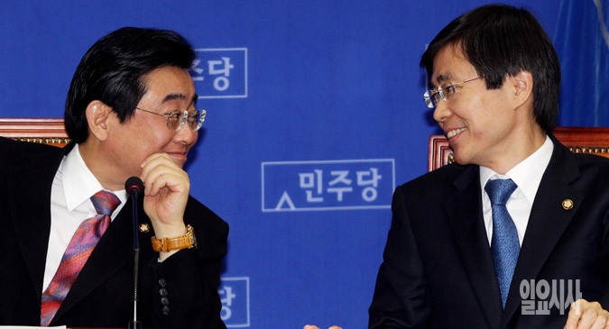 민주당 전병헌 원내대표(왼쪽)와 조경태 최고위원이 19일 서울 여의도 국회에서 열린 최고위원회의에서 이야기를 나누고 있다.