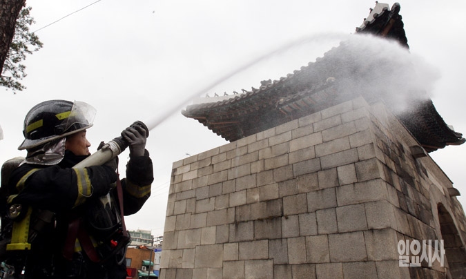 19일 서울 중구 광희문에서 중구소방서 대원들이 문화재 화재 초기대응을 위한 합동소방훈련을 하고 있다.