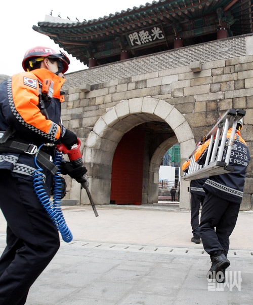 19일 서울 중구 광희문에서 중구소방서 대원들이 문화재 화재 초기대응을 위한 합동소방훈련을 하고 있다.