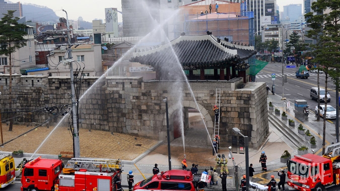 19일 서울 중구 광희문에서 중구소방서 대원들이 문화재 화재 초기대응을 위한 합동소방훈련을 하고 있다.