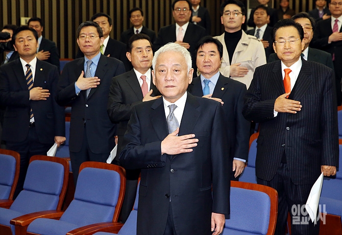 19일 오전, 민주당 김한길 대표 및 의원들이 서울 여의도 국회에서 열린 당무위원회의 직전, 국민의례를 하고 있다.