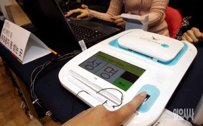 21일 서울 잠실동 잠실실내체육관에서 열린 제6회 전국동시지방선거 대비 사전투표 및 개표시연회에서 투·개표사무원들이 투표용지 확인 무인입력기 시연을 하고 있다.