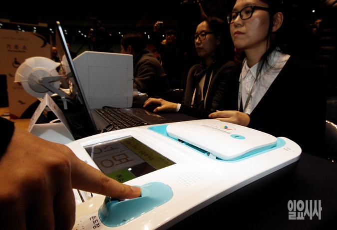 21일 서울 잠실동 잠실실내체육관에서 열린 제6회 전국동시지방선거 대비 사전투표 및 개표시연회에서 투·개표사무원들이 투표시연을 하고 있다.