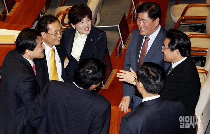 민주당 전병헌 원내대표와 정성호 원내수석부대표가 21일 서울 여의도 국회 본회의장에서 새누리당 최경환 원내대표를 비롯한 의원들을 찾아 논의를 하고 있다. 사진 오른쪽부터 시계방향으로 민주당 전병헌 원내대표, 정성호 원내수석부대표, 새누리당 윤상현 원내수석부대표, 박대출 대변인,  이채익 , 강은희 의원, 최경환 원내대표.