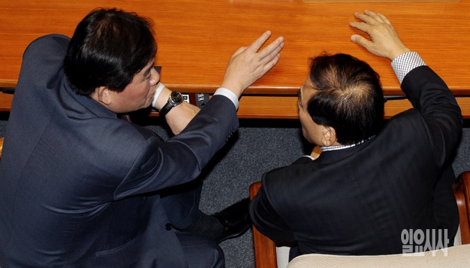 새누리당 최경환 원내대표(왼쪽)와 이재오 의원이 21일 서울 여의도 국회 본회의장에서 이야기를 나누고 있다.