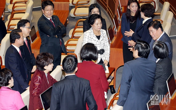 새누리당 최경환 원내대표(오른쪽 끝)를 비롯한 의원들이 21일 서울 여의도 국회 본회의장에서 원자력시설 등의 방호 및 방사능 방재 대책법(원자력방호방재법) 개정안과 관련해 이야기를 나누고 있다.