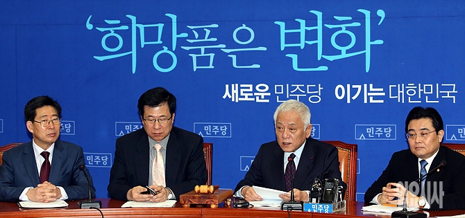 민주당 김한길 대표(사진 오른쪽에서 두 번째)가 25일 오전, 서울 여의도 국회에서 전병헌 원내대표(사진 오른쪽) 등이 참석한 가운데 마지막 최고위원회의를 진행하고 있다.