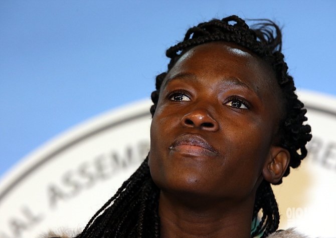 25일 오후, 아프리카예술박물관 피해 노동자 마리아씨가 국회 정론관에서 민주당 을지로위원회와 아프리카예술박물관의 합의 사항 이행 촉구 기자회견 도중 잠시 회환에 빠져 있다.
