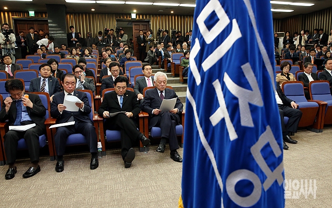 김한길 민주당 대표 등이 참석한 가운데, 25일 오전 새정치민주연합 중앙당 창당대회를 하루 앞두고 마지막 의원총회가 열리고 있다.