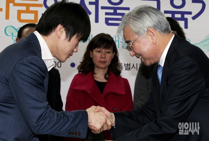 25일 서울 종로구 서울시교육청에서 열린 '2014년 교육기부단' 발대식에서 아테네올림픽 유도 금메달리스트 이원희(왼쪽)가 문용린 서울시교육감에게 위촉장을 받은 뒤 악수를 나누고 있다.
