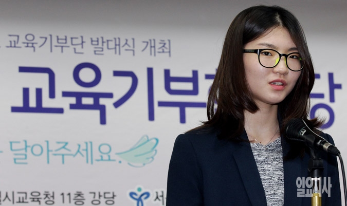 25일 서울 종로구 서울시교육청에서 열린 '2014년 교육기부단' 발대식에서 소치 동계올림픽 쇼트트랙 금메달리스트 심석희 선수가 참석자들에게 응원메시지를 하고 있다.