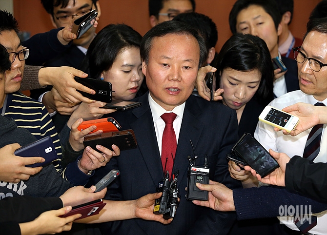 25일 오후, 새누리당 김재원 공천위 부위원장이 서울 여의도 국회 정론관에서 공천위회의 결과 브리핑 직후 취재진에 둘러싸여 있다.