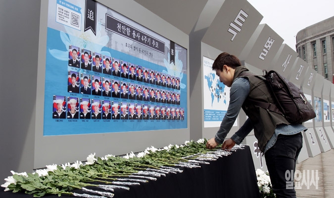 천안함 피격 4주기 날인 26일 서울시청 앞 광장에서 열린 '천안함 용사 4주기 추모 특별 사진전'에서 한 시민이 헌화를 하고 있다.
