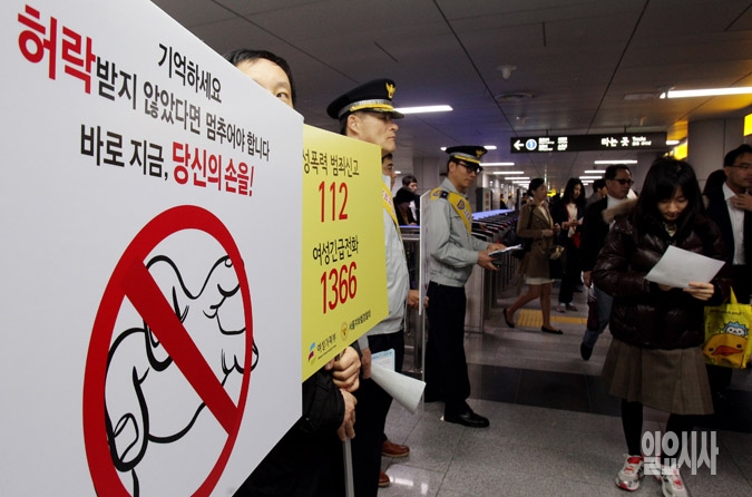 26일 서울 시청역에서 서울지방경찰청 지하철경찰대, 여성가족부, 서울메트로 직원 등이 출근하는 시민들에게 지하철 성폭력 예방 홍보캠페인을 벌이고 있다.
