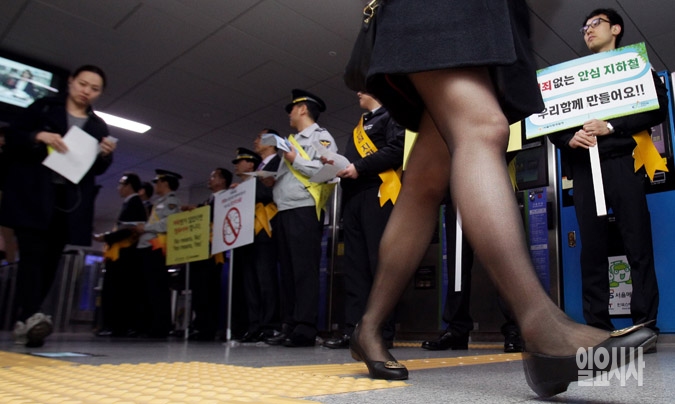 26일 서울 시청역에서 서울지방경찰청 지하철경찰대, 여성가족부, 서울메트로 직원 등이 출근하는 시민들에게 지하철 성폭력 예방 홍보캠페인을 벌이고 있다.