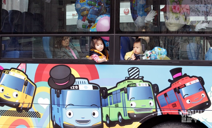 26일 서울시청 앞 광장에서 열린 인기 애니메이션 '꼬마버스 타요'의 캐릭터 버스 출동식에서 어린이들이 버스를 타고 있다. 버스운송사업조합과 ㈜아이코닉스는 대중교통 이용의 날을 맞아 이날부터 한달간 '꼬마버스 타요'의 캐릭터인 타요·로기·라니·가니가 그려진 시내버스 4대를 운행한다고 밝혔다.