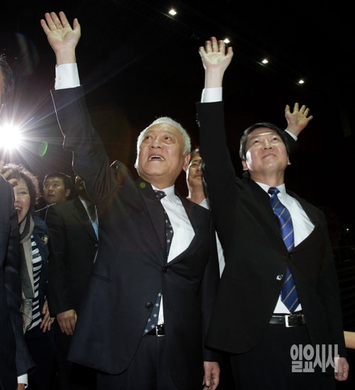 새정치민주연합 김한길, 안철수 공동대표가 26일 서울 송파구 올림픽홀에서 열린 새정치민주연합 창당대회에 참석하고 있다.