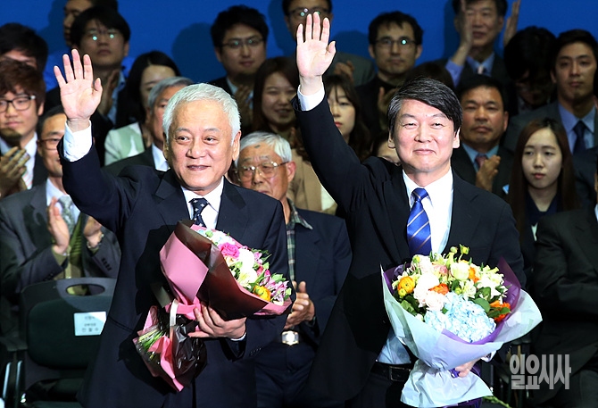 26일 오후, 송파구 방이동 올림픽공원 올림픽홀에서 열린 새정치민주연합 중앙당 창당대회 직후 김한길(사진 왼쪽)·안철수 공동대표가 지지자들과 당직자들을 향해 손을 흔들고 있다.