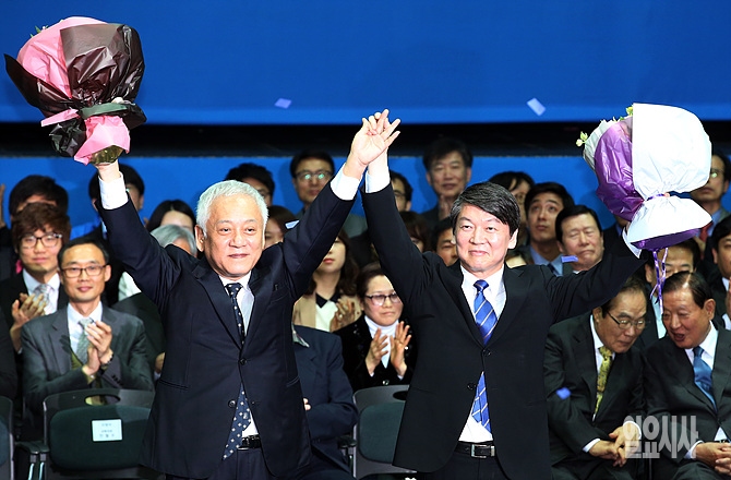 김한길(사진 왼쪽)·안철수 공동대표가 26일 오후, 송파구 방이동 올림픽공원 올림픽홀에서 열린 새정치민주연합 중앙당 창당대회 직후 서로 꽃다발 든 손을 들고 만세를 하고 있다.