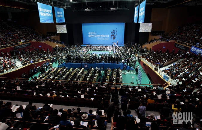 26일 서울 송파구 올림픽홀에서 김한길, 안철수 공동대표를 비롯한 대의원들이 참석한 가운데 새정치민주연합 창당대회가 열리고 있다.