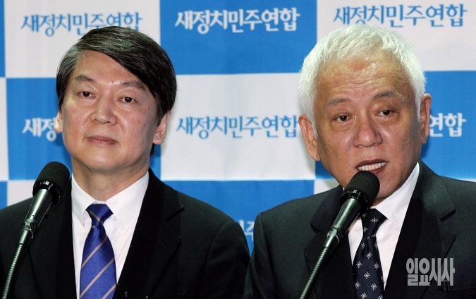 새정치민주연합 김한길, 안철수 공동대표가 26일 서울 송파구 올림픽홀에서 열린 새정치민주연합 창당대회를 마친 뒤 기자회견을 갖고 취재진의 질문에 답하고 있다.