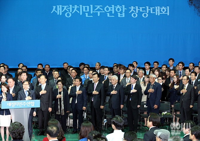 26일 오후, 새정치민주연합 김한길·안철수 공동대표 등이 서울 송파구 올림픽홀에서 열린 새정치민주연합 창당대회 직전, 국기에 대한 경례를 하고 있다.