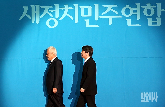 26일 오후, 새정치민주연합 김한길·안철수 공동대표가 서울 송파구 올림픽홀에서 새정치민주연합 창당대회 직후 함께 단상 아래로 이동하고 있다.