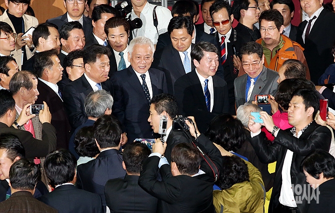 26일 오후, 새정치민주연합 김한길·안철수 공동대표가 서울 송파구 올림픽홀에서 열린 새정치민주연합 창당대회 직후 인파에 둘러싸여 있다.