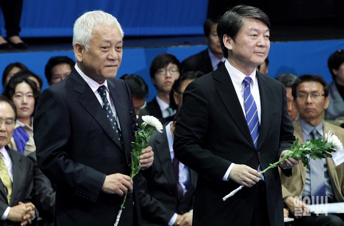 김한길, 안철수 공동대표가 26일 서울 송파구 올림픽홀에서 열린 새정치민주연합 창당대회에서 천안함 희생자들에게 헌화를 하고 있다.