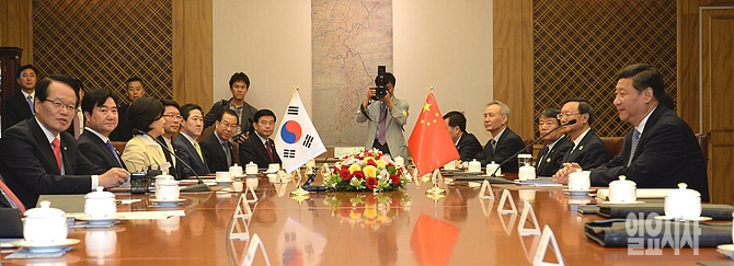 4일, 시진핑 국가주석이 서울 여의도 국회를 찾은 가운데, 정의화 국회의장이 대담을 나누고 있다. (사진공동취재단)