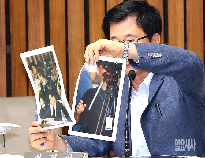 신경민 새정치민주연합 의원이 7일 서울 여의도 국회에서 열린 이병기 국정원장 후보자 인사청문회에서 국정원 직원이 임시취재증을 패용하고 야당 의원들의 자료를 촬영한 사진을 들어보이고 있다.