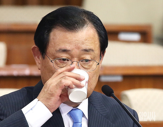 7일 서울 여의도 국회에서 열린 이병기 국정원장 후보자 인사청문회 도중 목이 타는 듯 물을 들이키고 있다.